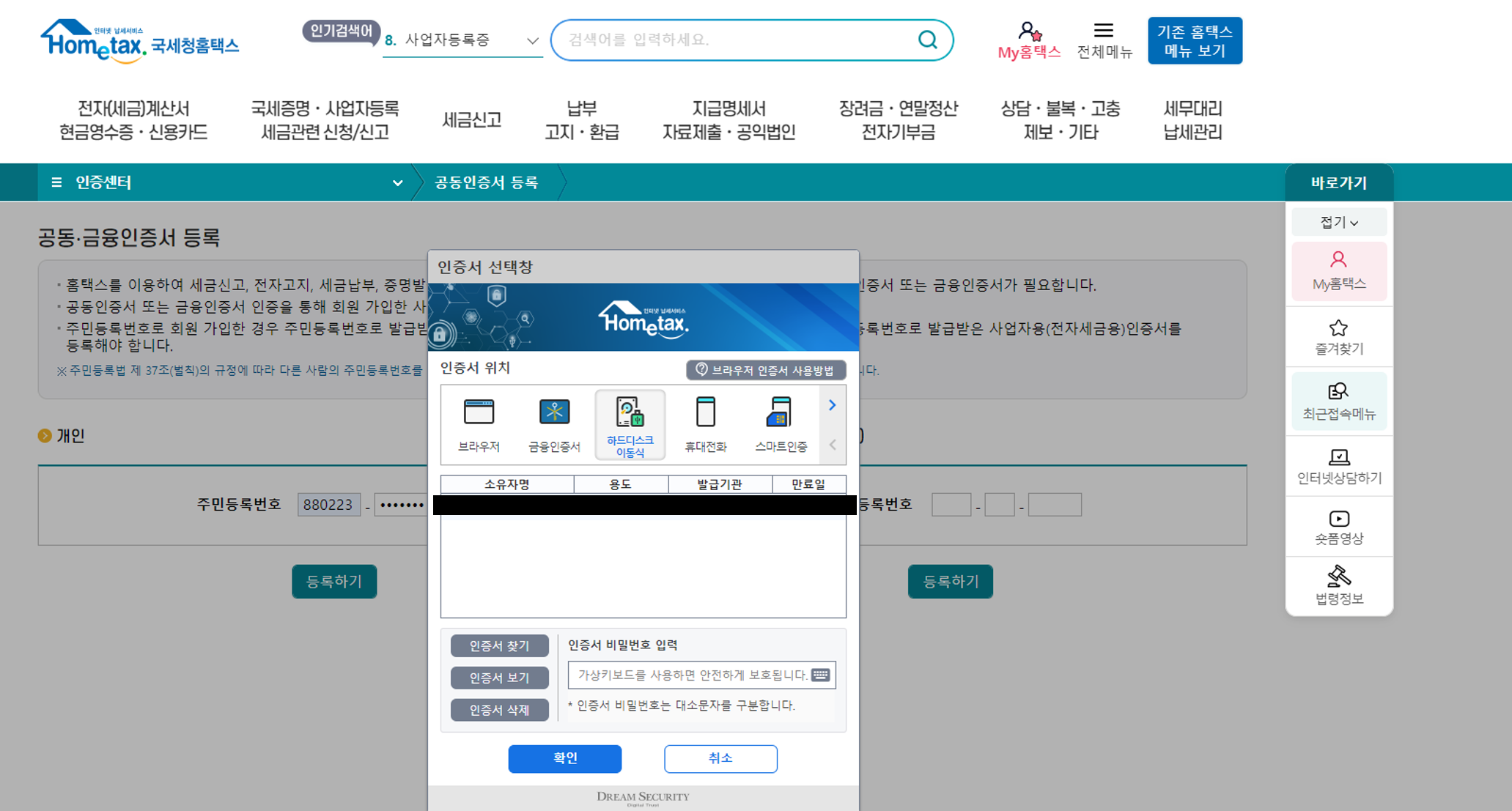 4. 공동인증서를 선택하고 암호를 입력하면 등록 완료됩니다.